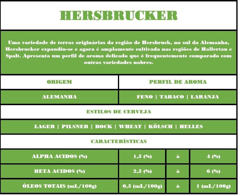 Cultivado para substituir o lúpulo mittelfrüh com características parecidas. O lúpulo hallertauer hersbrucker é um lúpulo alemão com baixo teor de alfa ácido e cohumulone. De aroma fino e nobre, possui baixo teor de ácidos alfa, de toque. Agradable, moderadamente especiado, noble aroma a tierra, floral y levemente afrutado. Expect spice, fruit and floral characteristics.